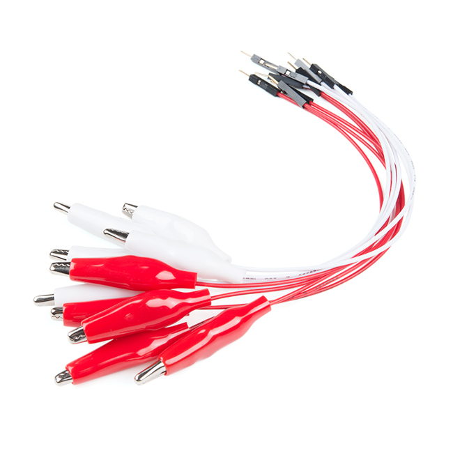 This is a 10-pack of wires that are pre-terminated with an alligator clip on one end and a hookup pigtail on the other. Alligator clips are a staple item for any workbench or makerspace, and with these cables you will be able to easily incorporate those clips into a breadboard, development platform or anything else to which you would normally be able to attach a hookup wire.