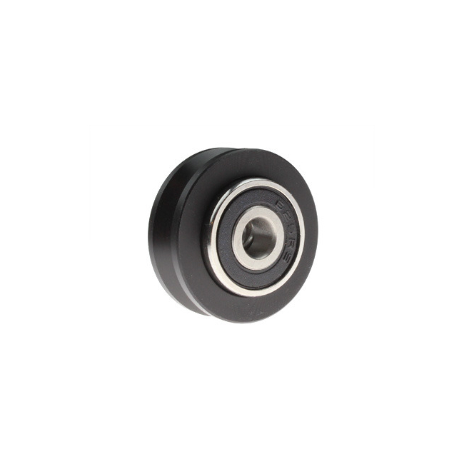 This is double bearing, Delrin, V wheel. It uses (2) 5×16×5 bearings and a precision shim washer. It has very low runout, so it will run wobble free. The mounting is very simple with only a 5mm hole required.