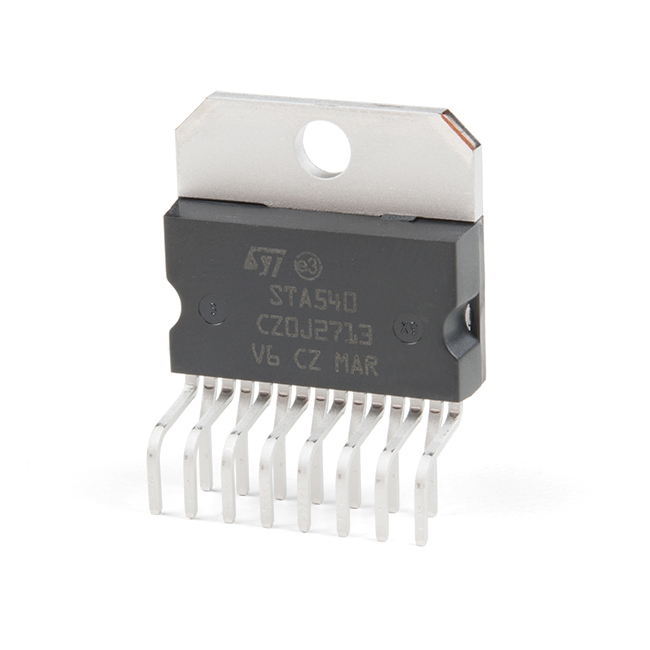 The STA540 from STMicro is a 4-channel, class AB audio amplifier designed for high quality sound applications. The four independent channels makes this amplifier a great choice for a number of projects, with needs ranging from four speakers stereo (F/R) to two-speaker bridge solutions. The chip accepts a voltage supply ranging from 8 to 22VDC and has very high output power capability.