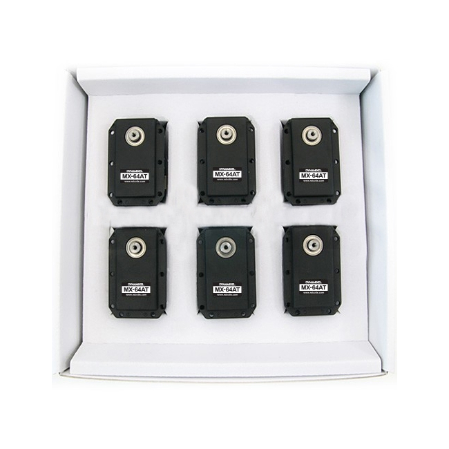 Robotis - DYNAMIXEL MX-64AT 6pcs Bulk (Aluminium front case). The Dynamixel MX Series servos feature a contactless (Magnetic) position encoder and PID control for superior accuracy and reliability. The MX series offers 12bit (4096) position resolution and can operate in the 360º range offering 0.008º resolution.