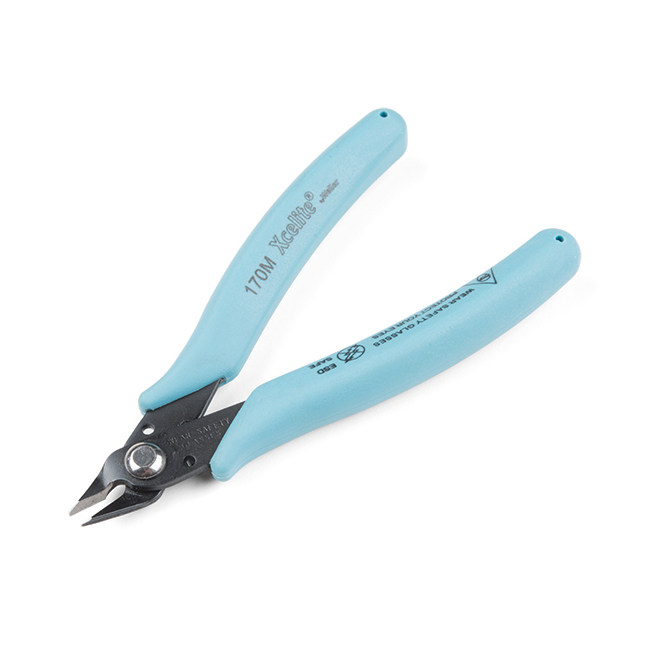 These are simple flush cutters from Excelite that give you a way to cut leads very cleanly and close to the solder joint. Diagonal cutters are good, but if you really need to get up close and personal, flush cutters are the way to go! Each pair of these cutters has a 3/4in jaw length and are 5in in overall length. This tool flush cuts soft wire up to 20 AWG (0.8mm) and is ESD safe.
