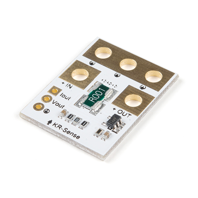 The KR Sense 45A is a small voltage and current sense breakout board. DC current is determined by measuring a voltage drop across a parallel shunt resistor, then converted to a final analog voltage output by the INA-169. Voltage sense is accomplished by scaling to 3.3V ADC range by a precision resistor divider. This version of the sensor features a maximum voltage tolerance of 51.8V at 44.7A, to be exact.