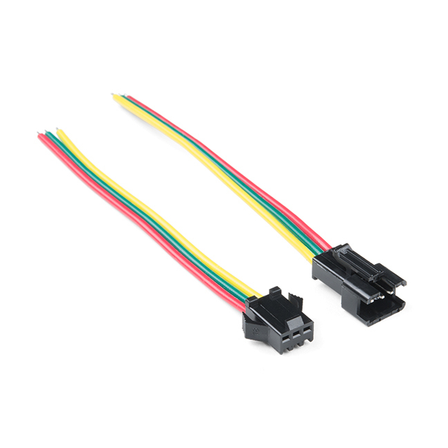 Each connector pack comes with one male and one female connector. The 20AWG wire leads are colored in a red/green/yellow sequence, are almost 4 inches (10cm) long and are terminated with a JST-SM connector on one end and left bare on the other.