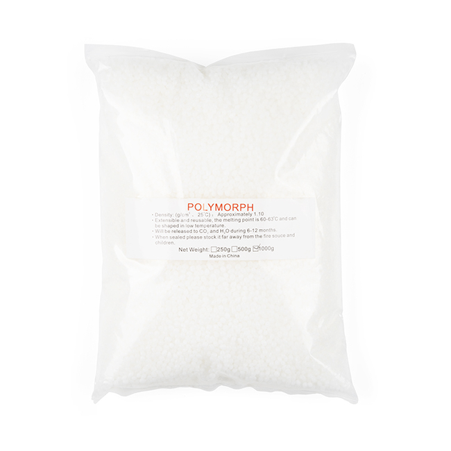 Polymorph is a non-toxic, biodegradable polyester with a low melting temperature of about 60°C (140°F). Prototype plastic parts can be made by simply heating the plastic beads in hot water until they turn clear and then kneading them together and shaping by hand. When it cools it becomes a nylon-like white plastic. Polymorph can be re-used by simply re-heating and re-shaping. Plastic beads are supplied in a re-usable plastic container.