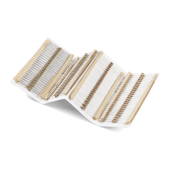 Our new branded resistor kit comes with 25 each of 20 different resistor values (including 0Ω links!). All of these resistors are stapled into a tri-fold pack and clearly labeled. The back of the resistor kit even has a resistor color code look-up chart and a table of color codes for the included resistors!