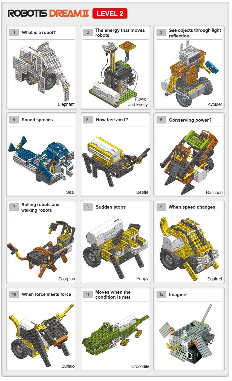 ROBOTIS DREAM II LEVEL 2 builds upon LEVEL 1 to develop a higher level understanding of robotics. It teaches the basics about the structure of robots, IR sensors, and microphone sensors. It also teaches the principles of speed, elasticity, inertia, acceleration, and resultant force. ROBOTIS DREAM II LEVEL 2 comes with 12 chapters of assembly, applications of principles, and problem solving.