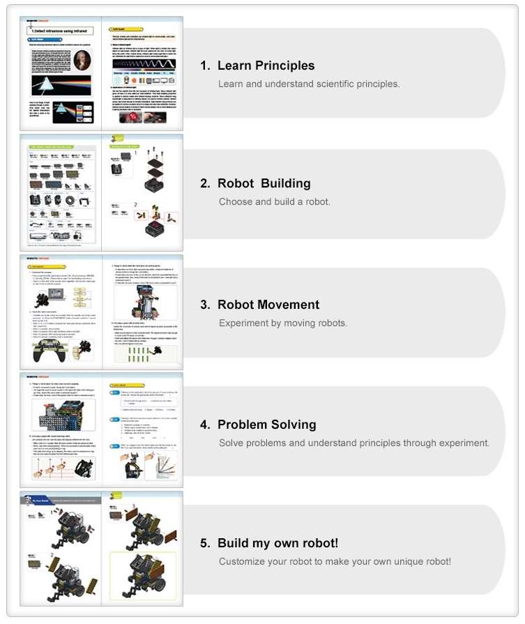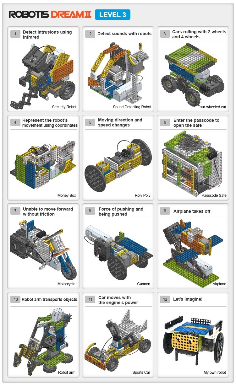 ROBOTIS DREAM II LEVEL 3 provides workbook and example robot for total of 12 weeks, It consists of concept learning, robot assembly, principle understanding and problem solving. While you make 12 different robots, you can learn the principle of robot production.