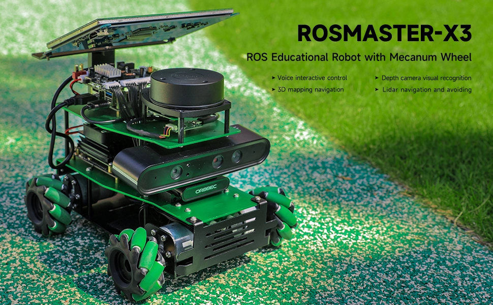 ROSMASTER X3 is an educational robot based on the robot operating system (ROS) with Mecanum Wheels, compatible with Jetson NANO/Xavier NX/TX2 NX and Raspberry Pi 4B.