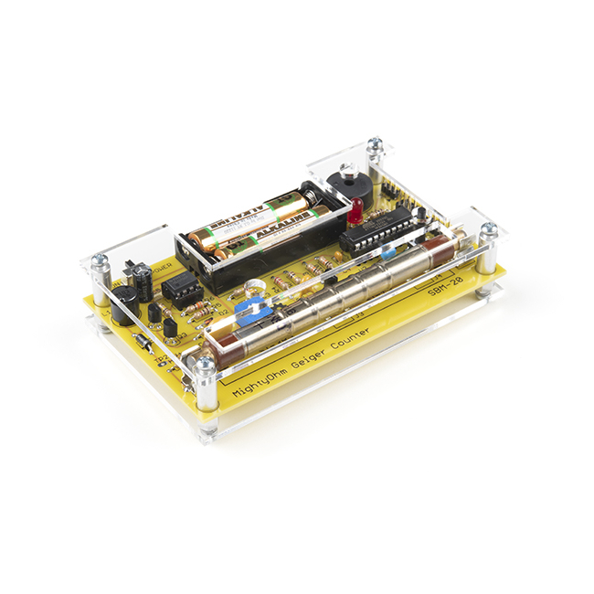 Detect beta and gamma radiation with your own portable Geiger counter! The MightyOhm Geiger Counter Kit++ includes all components needed to build a completely open source, hackable, working Geiger counter. The Kit++ includes a Geiger tube, Acrylic case, and AAA batteries.