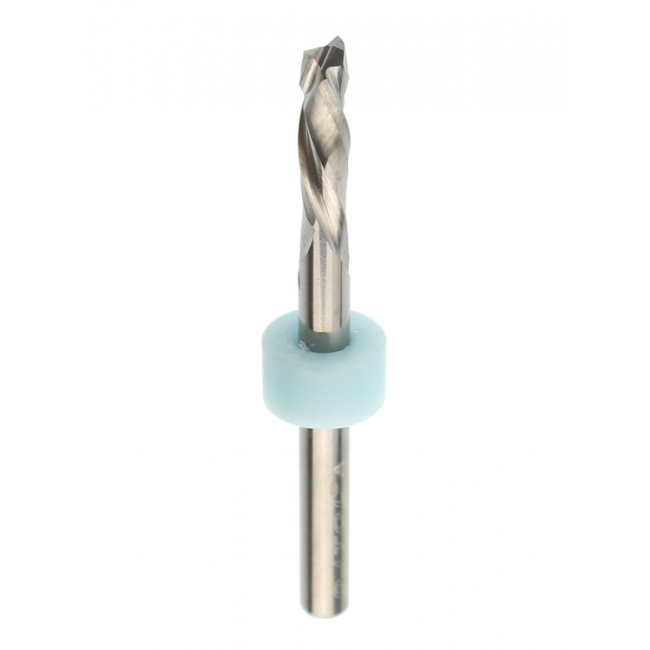Upcut bits pull up on your material while cutting to help clear chips, but can create some chipping or a rougher finish on the topside of your material. Downcut bits push down on your material while cutting to create a nice top finish, but that can lead to some chipping or a rougher finish on the bottom side of your material. Choose a style of bit to match the type of cut and finish you’d like to achieve.