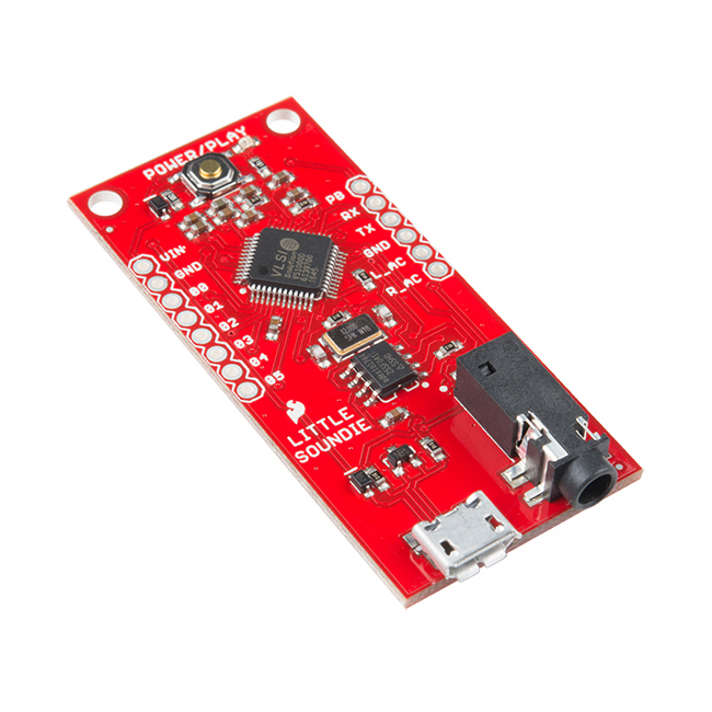 The SparkFun Little Soundie is a fun and easy-to-use audio playback device breaking out the VS1000D audio codec IC allowing this little board the ability to decode OGG Vorbis and WAV type files. The Little Soundie makes adding sound effects to your project, prop, or costume easy with the built-in USB mass storage for your audio files and simple methods of triggering audio playback. Beyond playing back your chosen audio files, the Little Soundie is remarkably easy to set up, with just four simple steps: connect to your computer using a micro-USB cable, press the power/play button, format the USB disk the Little Soundie creates and then just drag and drop your .ogg or .wav files over to the USB disk!