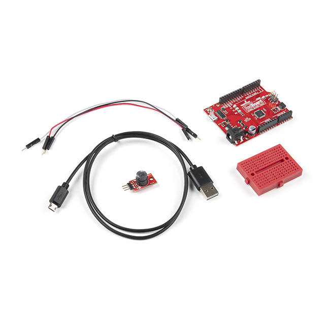 This PIR sensor offers digital output across 32 zones at 5m detection distance with 90° x 90° detection area. Additionally, the PIR in this kit already has headers soldered on making it easier to get started. This kit also includes a SparkFun RedBoard Qwiic, a mini breadboard, a 3-pack of jumper wires, and a reversible USB-A to Micro-B cable.